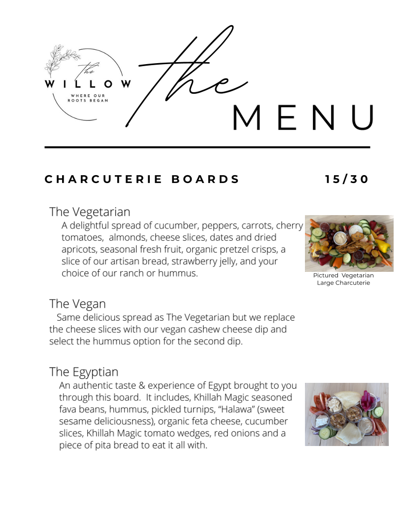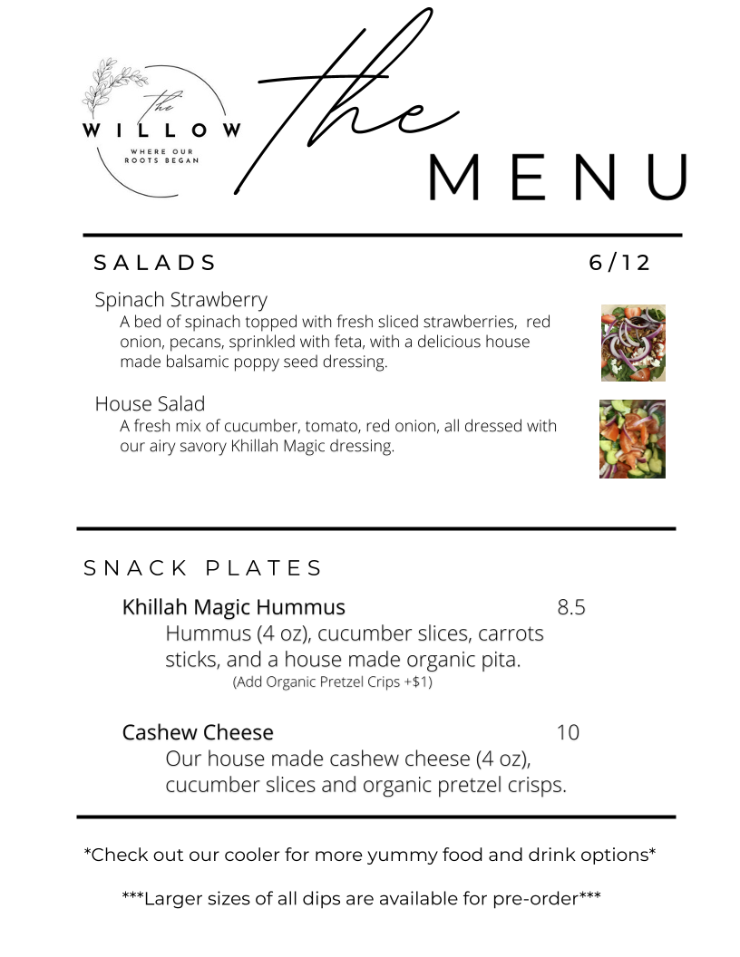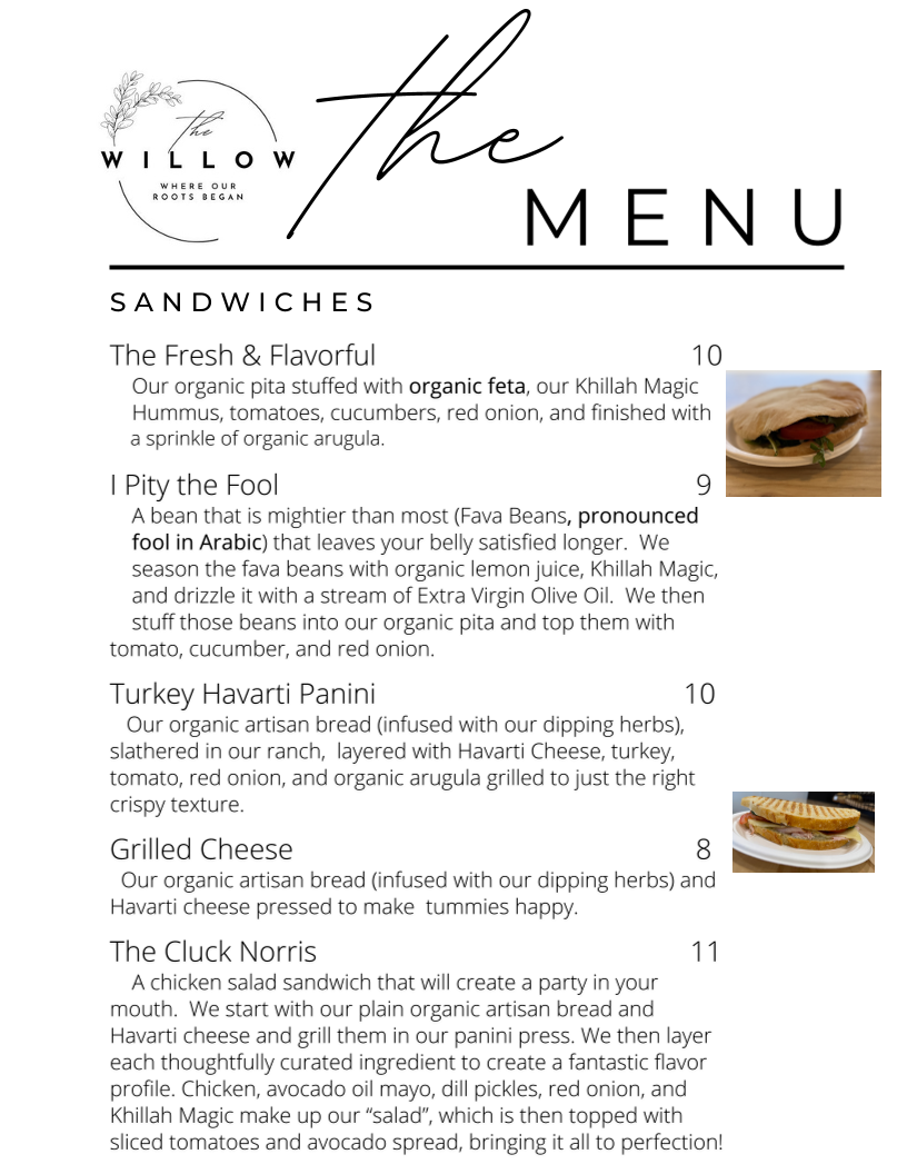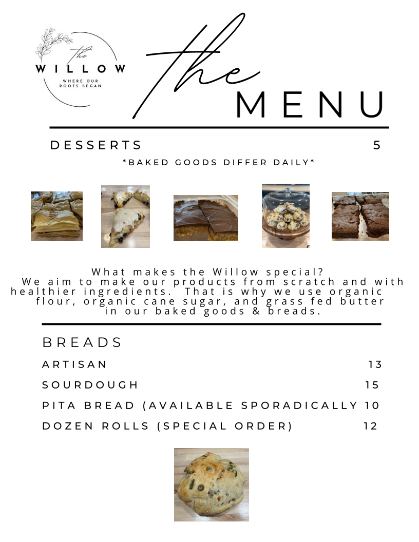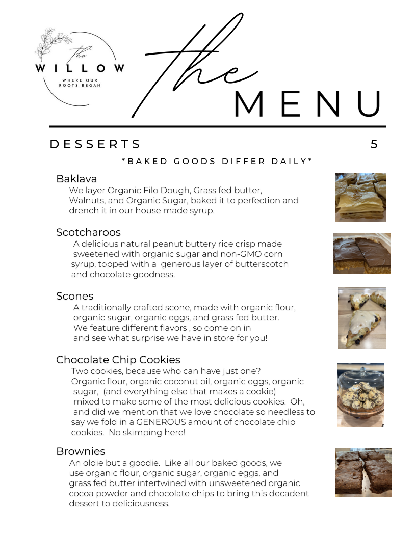 The menu offers a variety of items organized into several categories to suit different times of the day and dining preferences. Visitors can find a selection of desserts, including traditional and baked sweets such as baklava, Scotcharoos, scones, chocolate chip cookies, and brownies.
