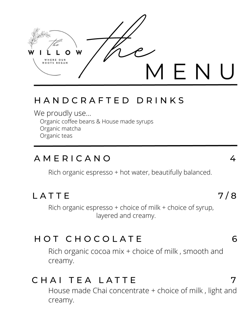 Additionally, the menu includes a range of beverage-related products such as flavored syrups—lavender, chocolate, maple syrup, and vanilla—along with organic whole milk and organic 2% milk to complement coffee and other drinks.